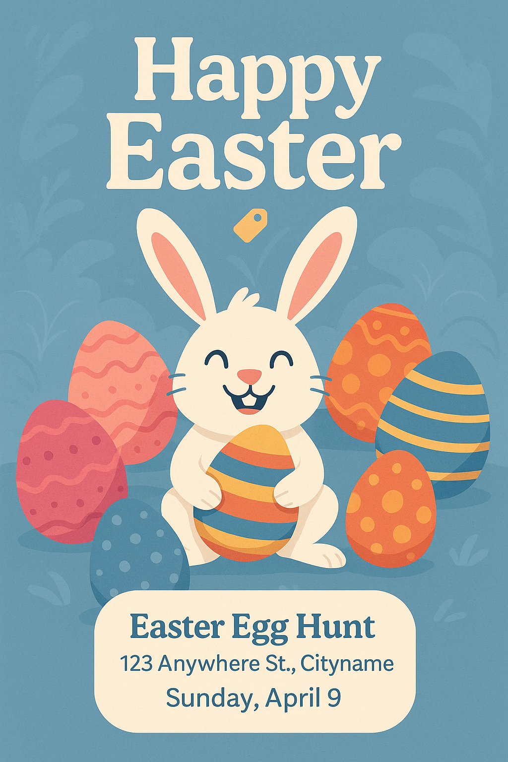 Charming Easter invitation featuring a cheerful bunny and colorful decorated eggs, ideal for family-friendly events and celebrations.