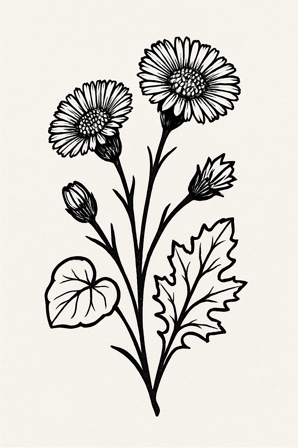 This image features a hand-drawn illustration of daisies and leaves in a minimalistic style, suitable for artistic projects and nature-themed designs.