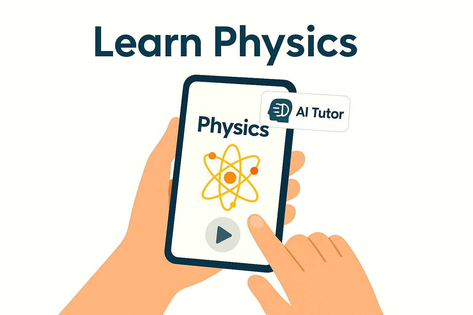 Illustrative graphic depicting a mobile app interface for learning physics, featuring a hand interacting with the screen. Ideal for educational marketing.