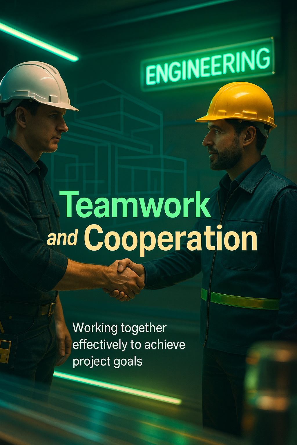 /Collection: /by davooda/Type: PNG/Engaging visual representation of teamwork and cooperation in an engineering context, featuring two professionals shaking hands, ideal for corporate training or motivational materials.