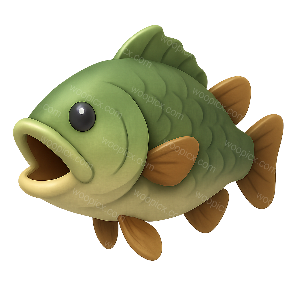 A stylized 3D bass fish icon featuring a friendly expression, with a transparent background. The fish is depicted in a three-quarter view, showcasing its green scales and brown fins.