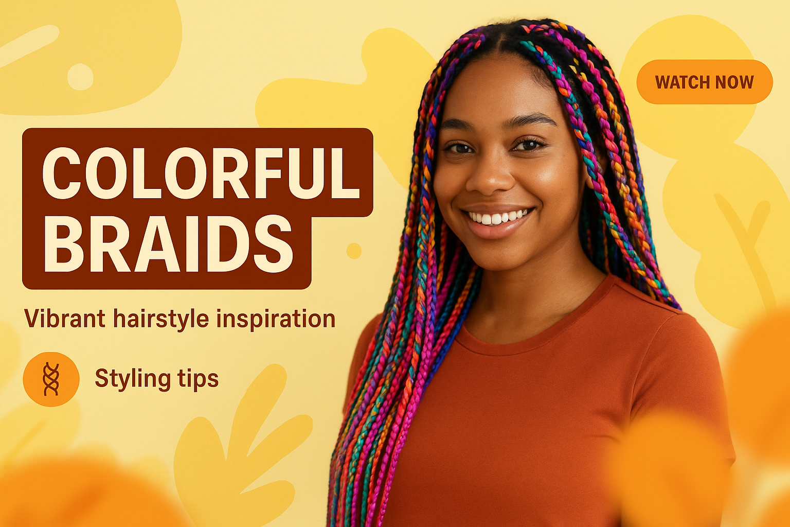 Engaging social media post showcasing vibrant braids with styling tips, featuring a cheerful model against a warm, playful background, ideal for beauty and fashion audiences.