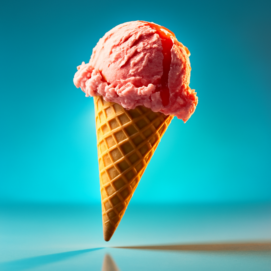 /Collection: /by davooda/Type: PNG/A realistic depiction of a pink ice cream scoop atop a cone, suspended in mid-air. The scene features a vibrant gradient background transitioning smoothly from blue to a lighter tone, creating a dynamic and engaging visual effect.