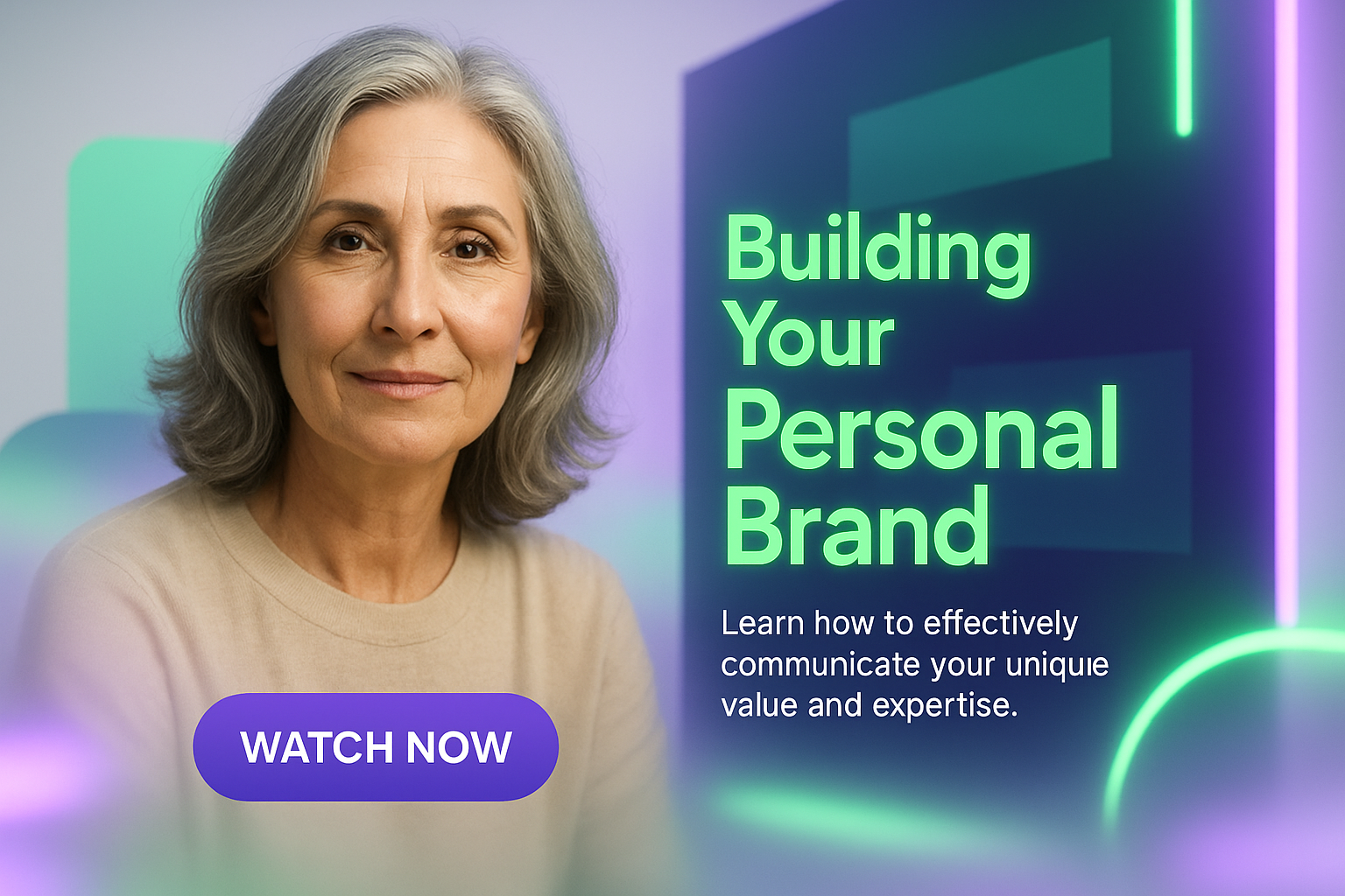 Engaging promotional graphic featuring a mature woman, designed to attract viewers to a personal branding course. The modern aesthetic and vibrant colors enhance its appeal.
