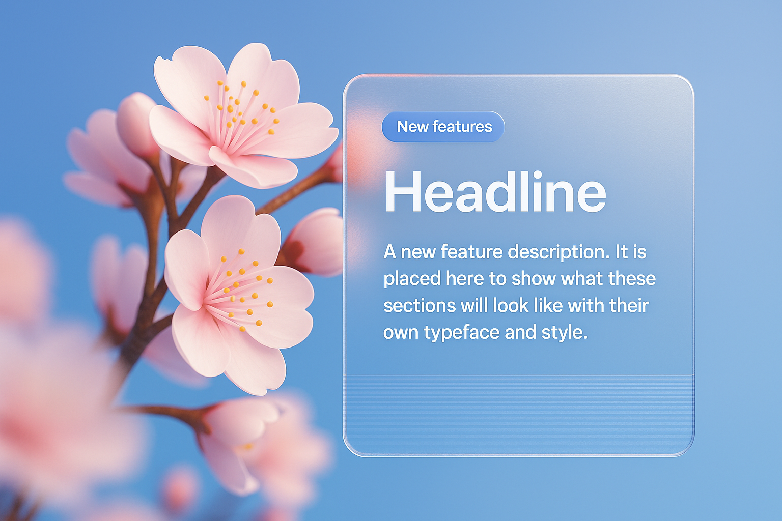 A vibrant 3D illustration of sakura flowers against a smooth gradient background, featuring a transparent block with a headline and description, showcasing modern design.