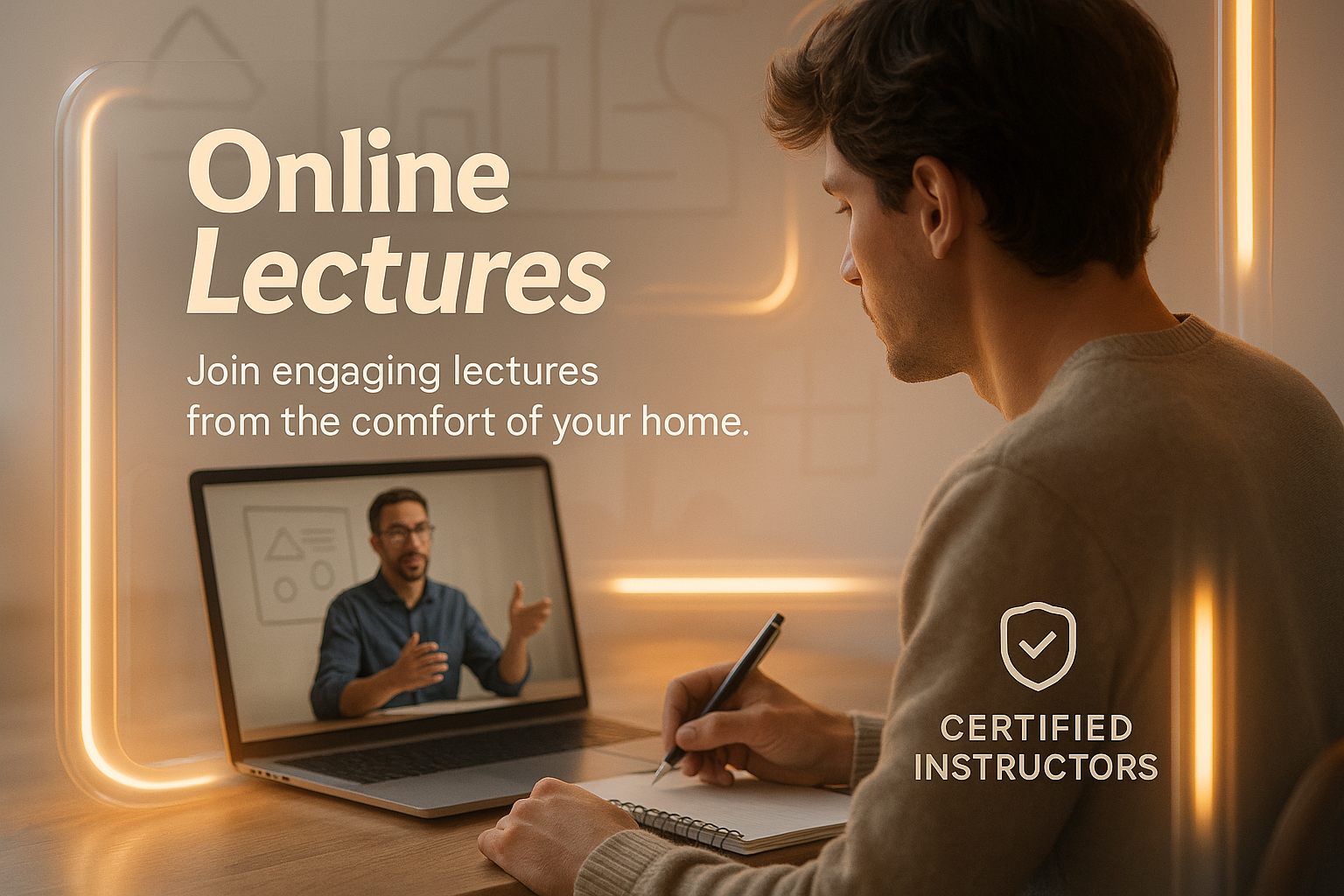 /Collection: /by davooda/Type: PNG/A promotional image highlighting online lectures with a focus on engaging remote learning. The visual style is warm and inviting, suitable for educational platforms targeting students and professionals.