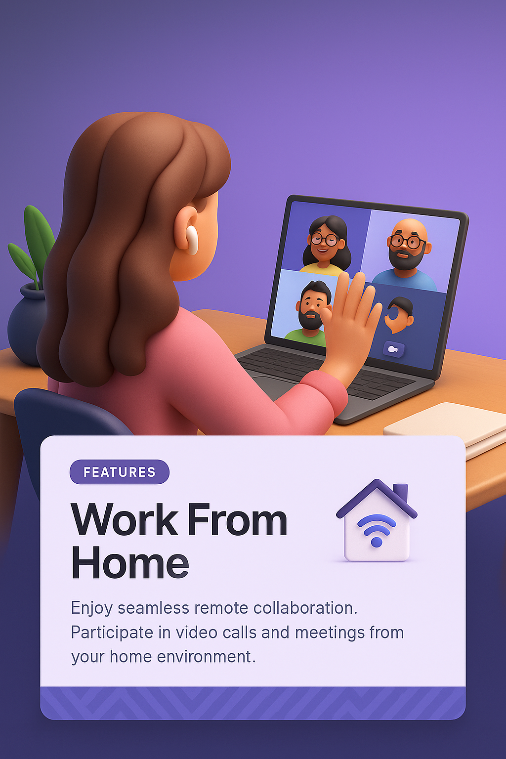 A female employee seen from the back, participating in a video call with colleagues. The scene emphasizes remote work and collaboration in a home setting.