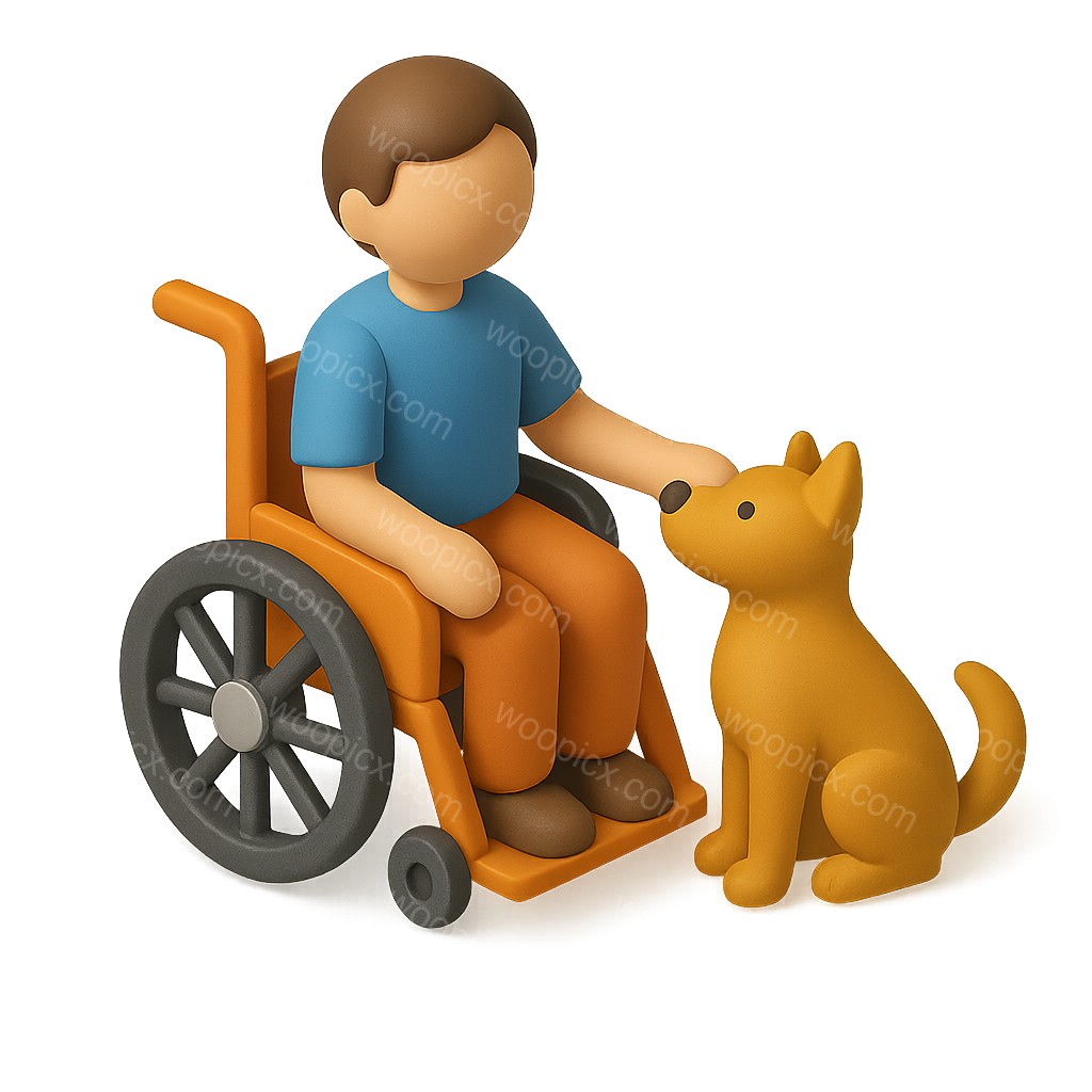 A colorful 3D icon depicting a person in a wheelchair interacting with a friendly dog. The scene features a three-quarter view with a soft gradient background, emphasizing a playful and warm atmosphere.
