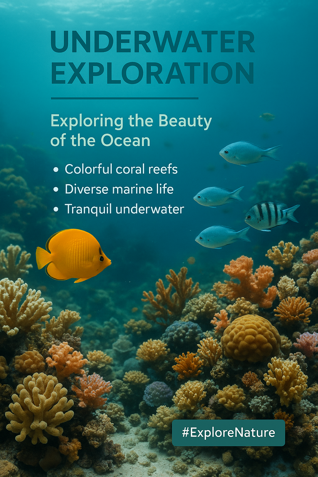 /Collection: /by davooda/Type: PNG/Vibrant underwater exploration poster featuring colorful coral reefs and diverse marine life, ideal for promoting environmental awareness and nature appreciation.