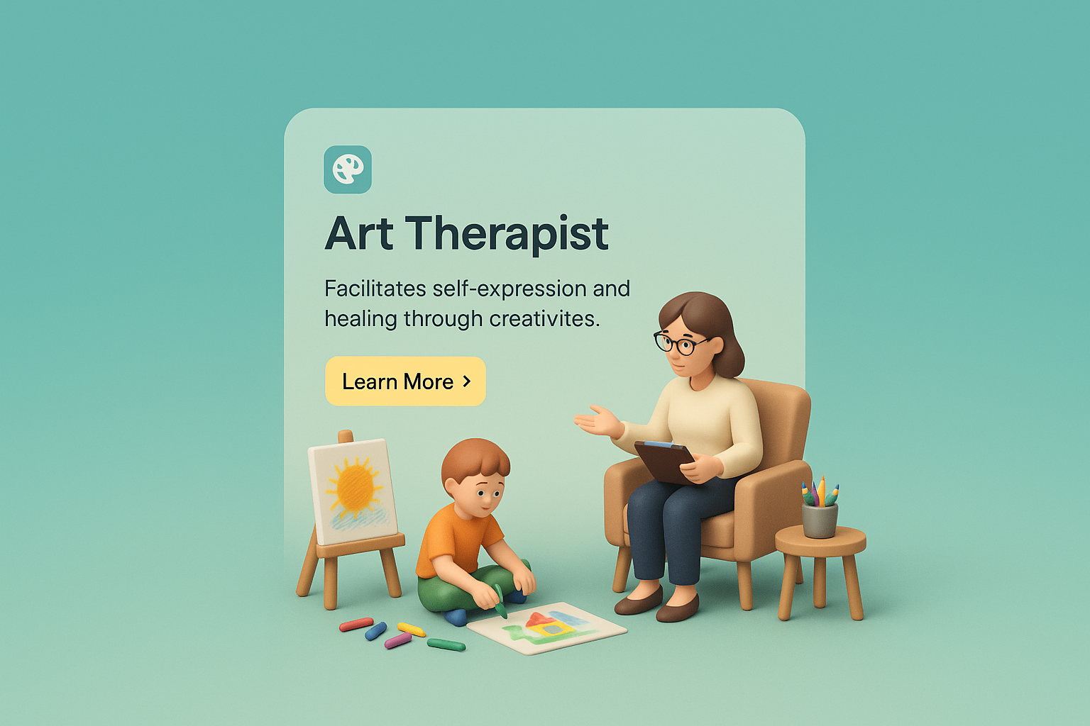 /Collection: /by davooda/Type: PNG/A 3D illustration depicting an art therapist guiding a child in a creative session. The scene features a gradient background, artistic elements, and a clear call to action button.