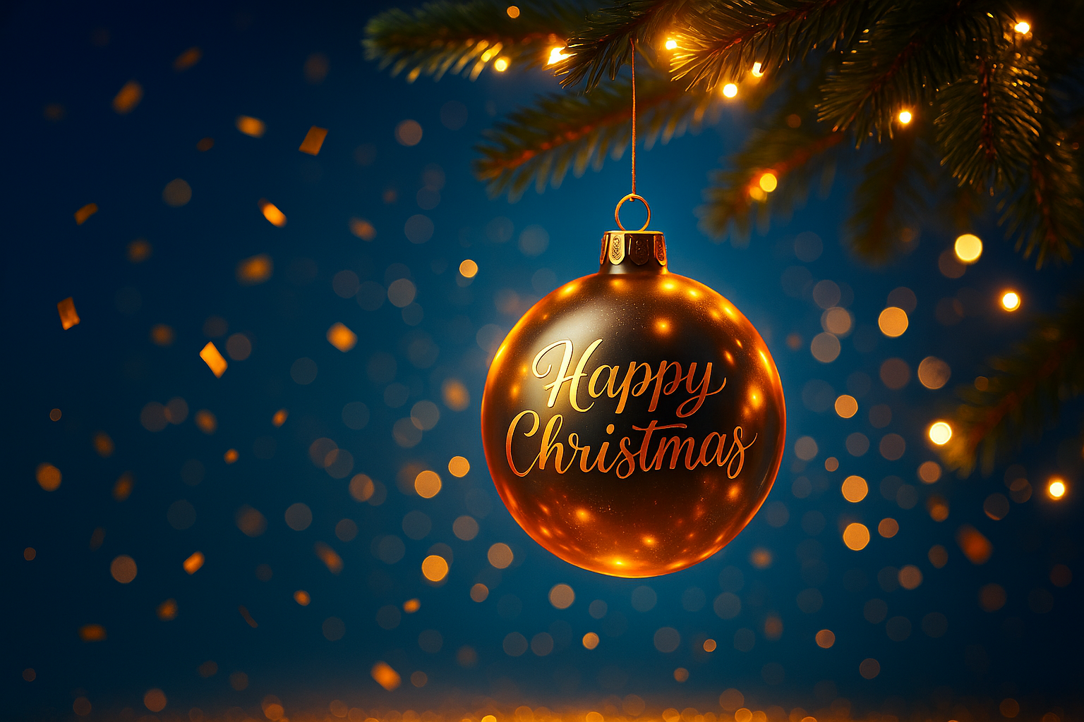 /Collection: /by davooda/Type: PNG/A stunning golden Christmas ornament hangs against a soft blue background, surrounded by shimmering bokeh and confetti, creating a warm festive atmosphere.