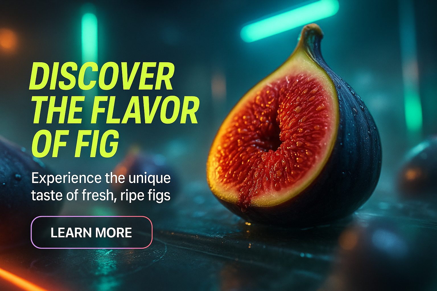 A striking carousel slide featuring a fresh fig illuminated by neon lights, emphasizing its juicy texture with engaging text. The design merges vibrant colors and a dynamic layout.