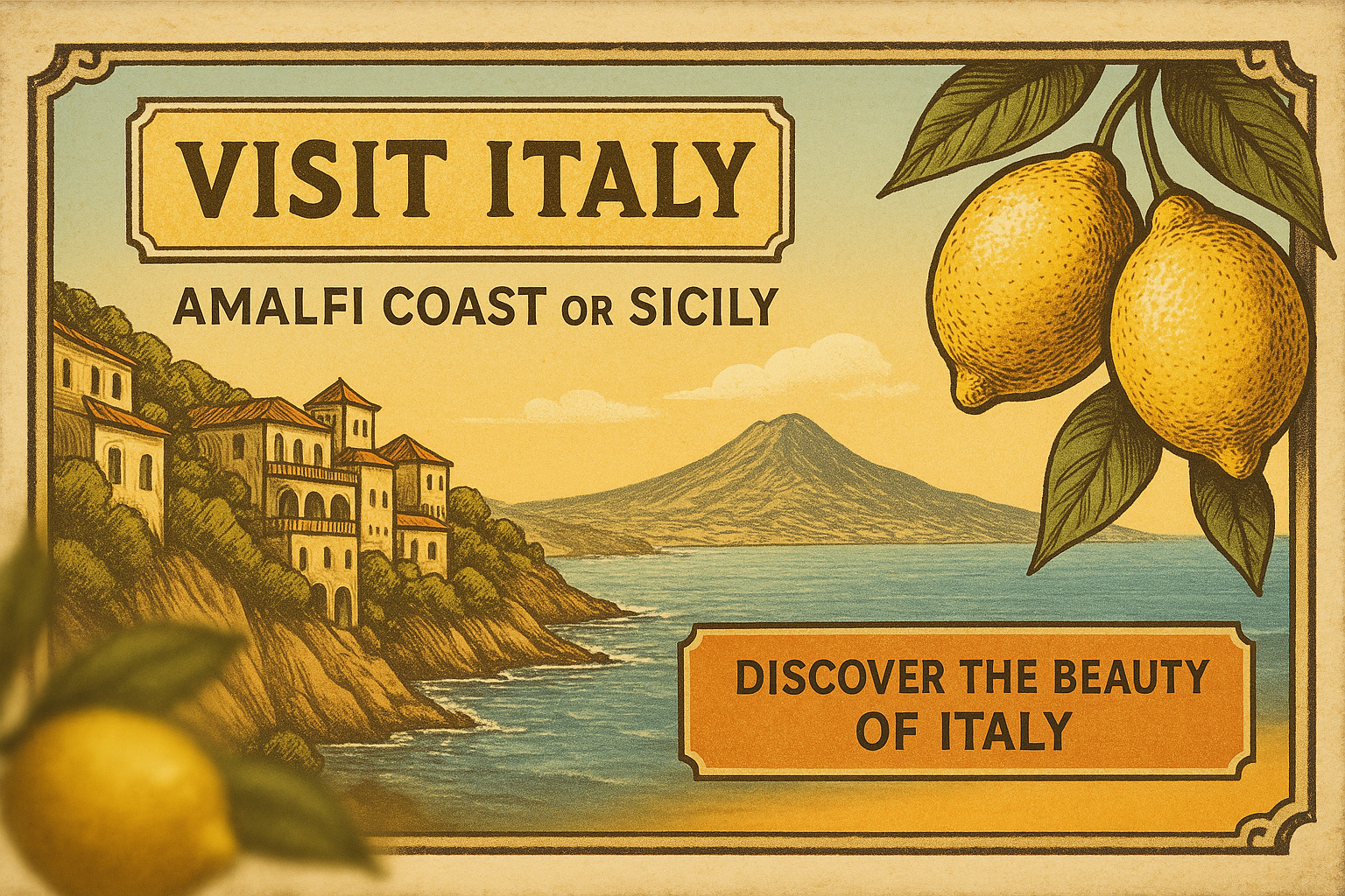 /Collection: /by davooda/Type: PNG/A charming vintage-style travel poster inviting viewers to explore Italy's Amalfi Coast or Sicily, featuring a scenic landscape and lemon motifs. Ideal for tourism promotion.