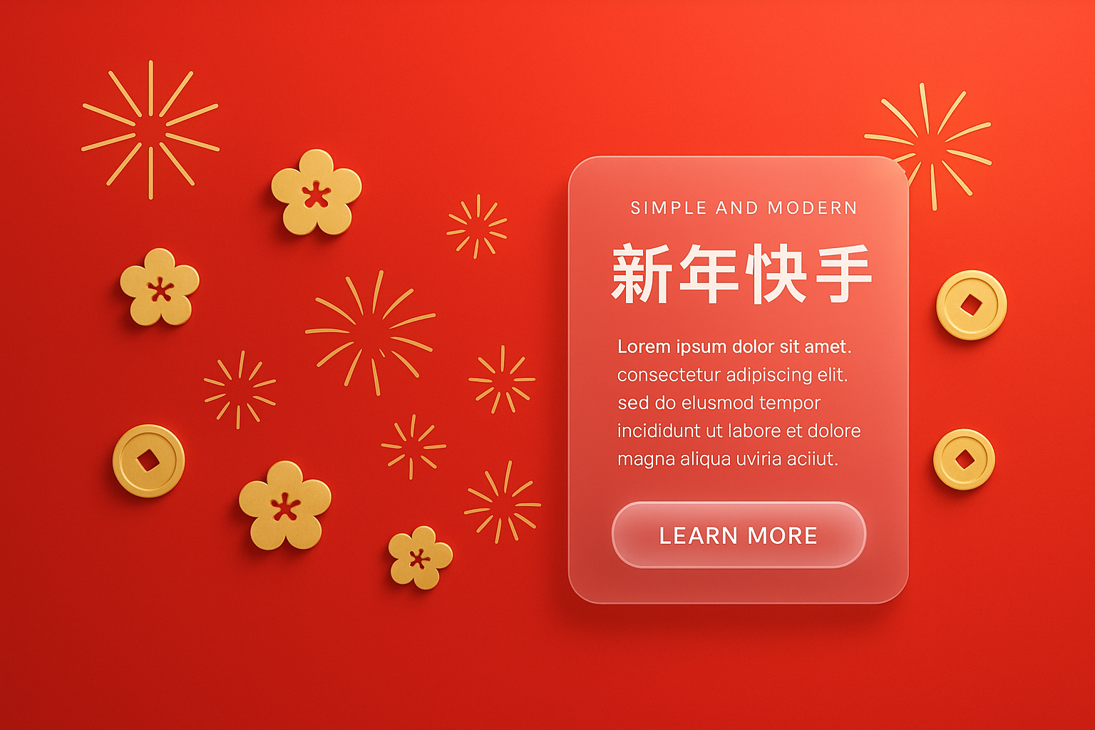 /Collection: /by davooda/Type: PNG/A vibrant red background features floral motifs, coins, and festive fireworks. The design includes modern glassmorphism panels with Chinese characters wishing a happy new year.