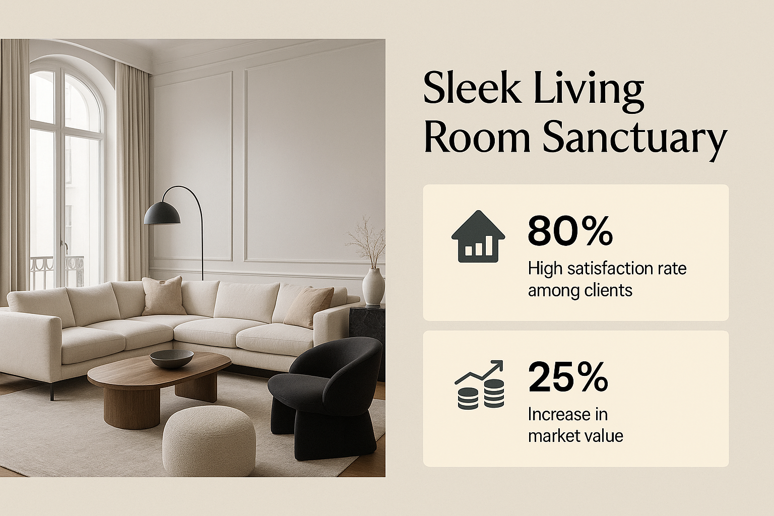 Modern Living Room Design Promotion with Client Satisfaction Stats