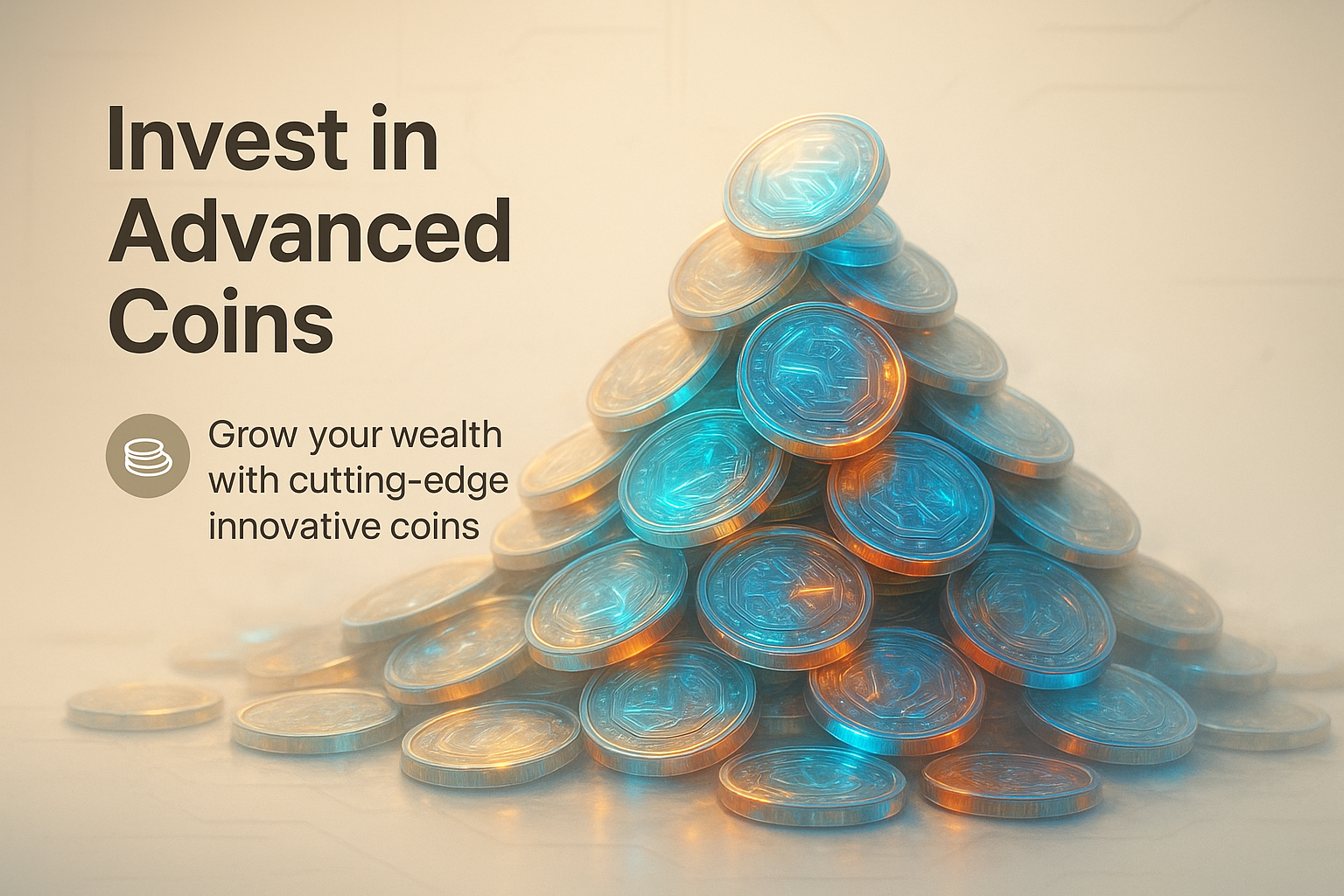 Engaging promotional graphic featuring a pyramid of coins emphasizing advanced cryptocurrency investment opportunities, designed for financial marketing.