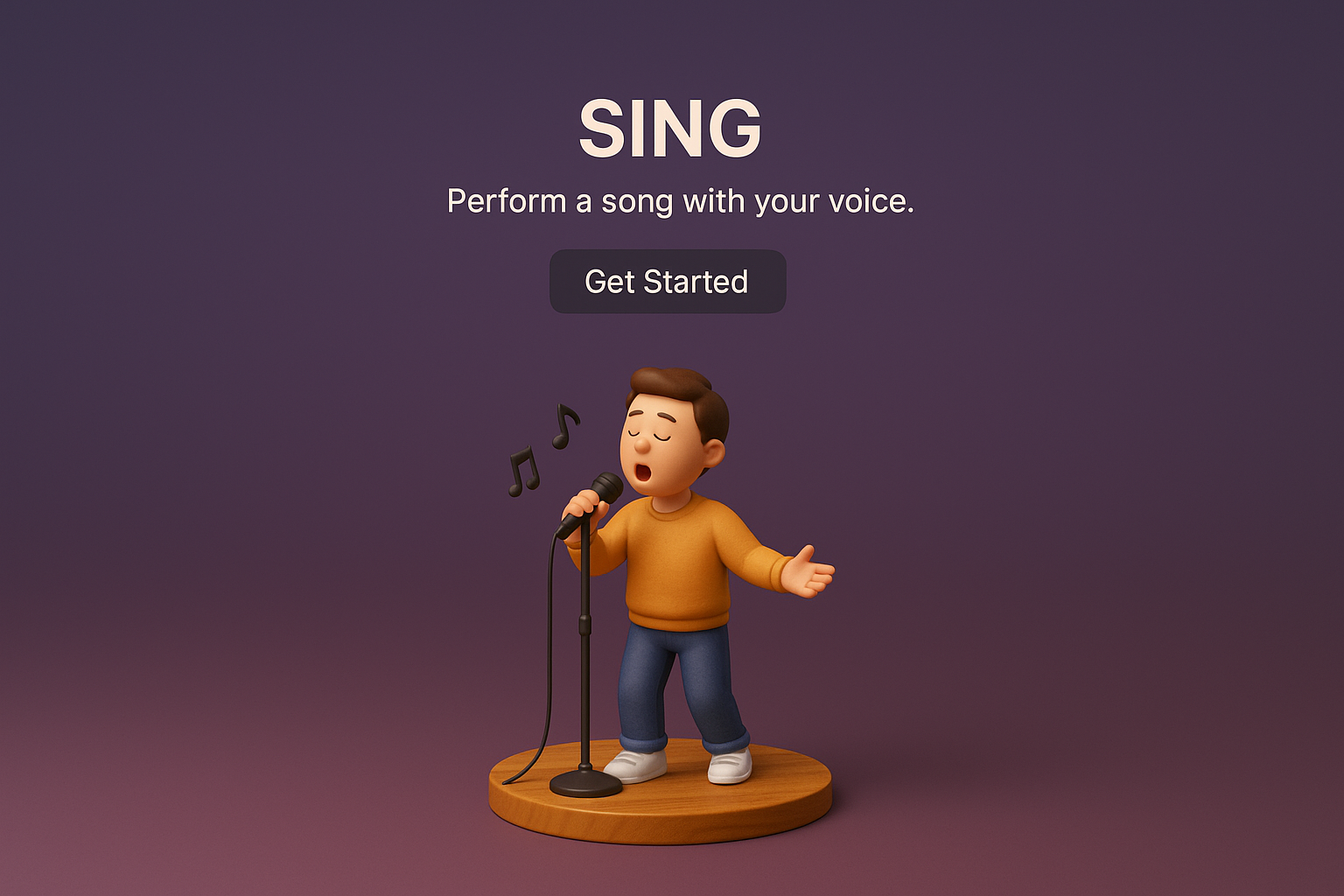 A zoomed-out, realistic 3D scene depicting a singer on stage with a microphone. The background features a smooth gradient transition, enhancing the vibrant colors of the scene.