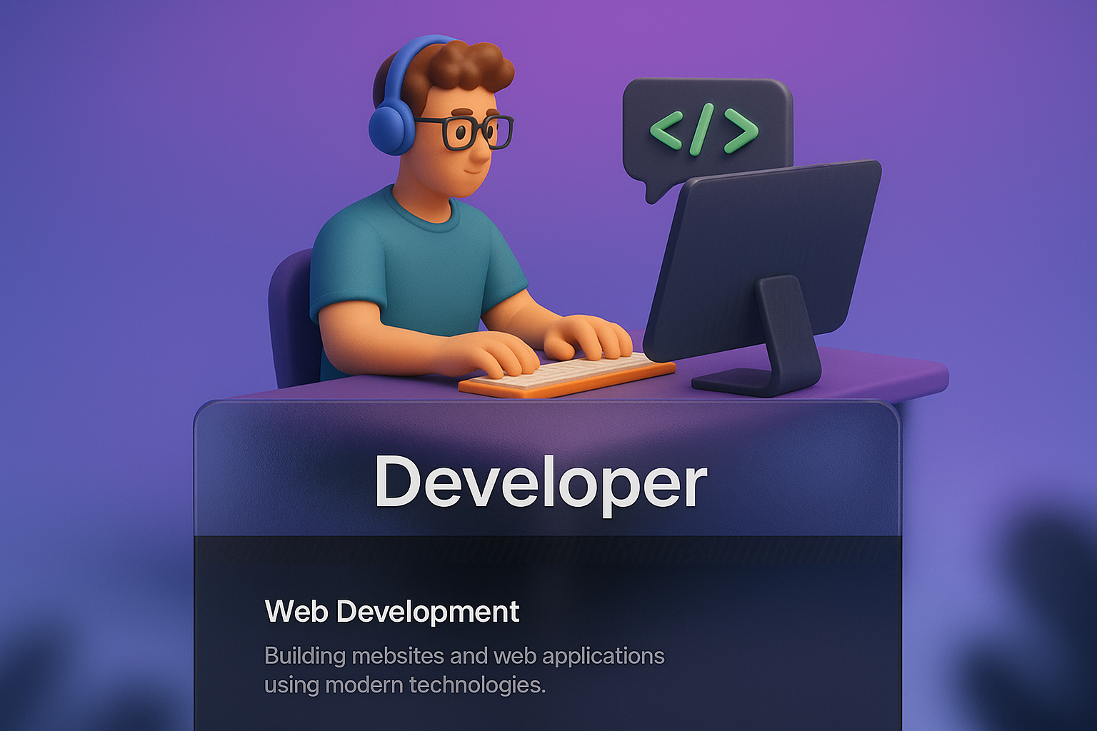 /Collection: /by davooda/Type: PNG/A modern 3D illustration of a developer working on a computer. The design features a gradient background, a prominent title block, and a stylish label, emphasizing web development.