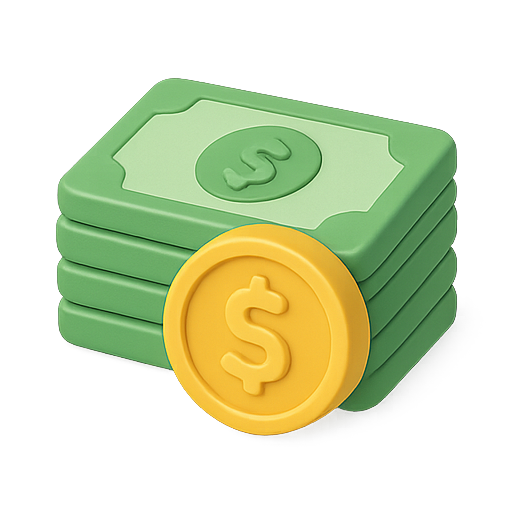 /Collection: /by davooda/Type: PNG/A vibrant 3D illustration showcasing stacks of money and a coin, ideal for financial topics, banking, or investment-related content. The playful design adds a modern touch.