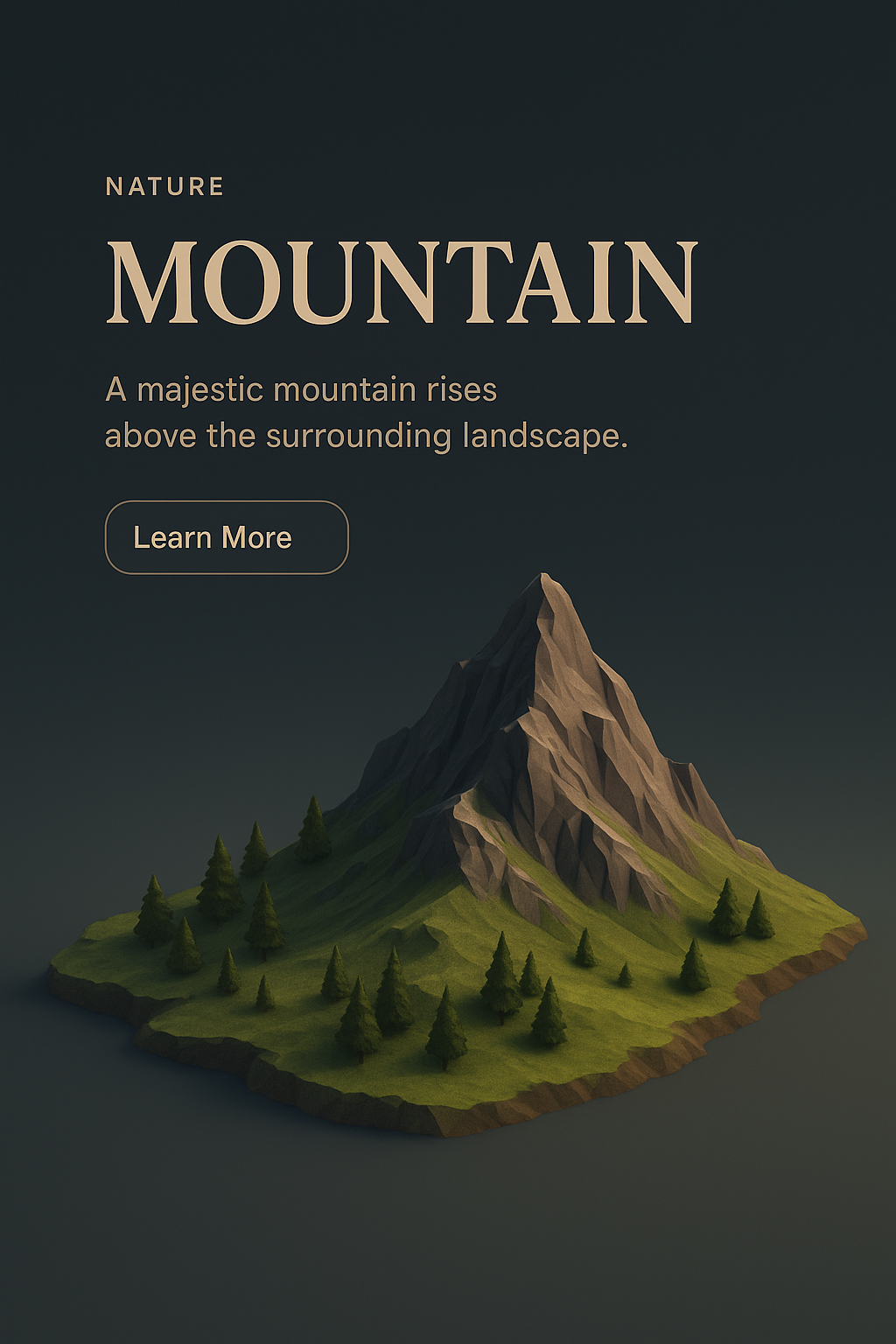 A beautifully rendered 3D mountain rises majestically above a serene landscape, featuring lush greenery and a dark gradient background, creating a captivating visual.