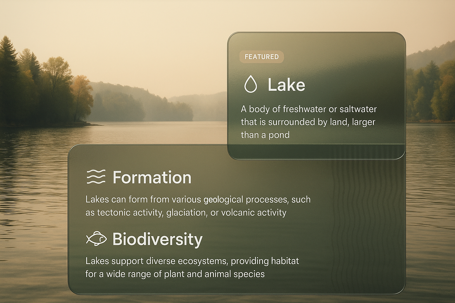 A serene lake scene featuring stylish overlay blocks. The design includes informative sections about lakes with a modern aesthetic, ensuring readability against a gradient background.