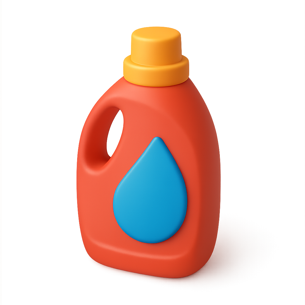 /Collection: /by davooda/Type: PNG/A vibrant 3D icon of a detergent bottle featuring a bright red body, an orange cap, and a blue droplet design. The image showcases a three-quarter isometric view with a transparent background.