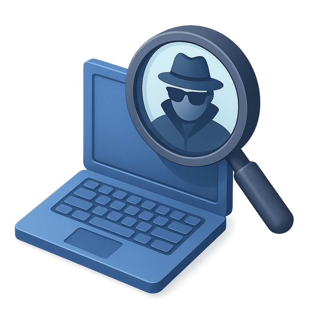 /Collection: /by davooda/Type: PNG/A 3D icon depicting a laptop with a magnifying glass focusing on a shadowy figure, symbolizing cyber-espionage. The design features a sleek, isometric style with a transparent background.