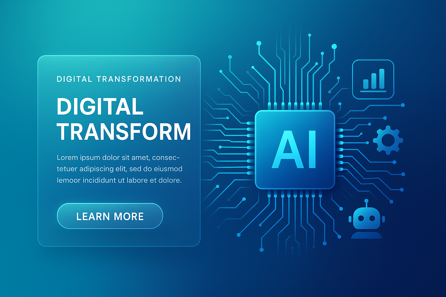/Collection: /by davooda/Type: PNG/An abstract digital transformation concept showcasing a futuristic data flow with AI and automation elements. The clean design features vibrant gradients and glassmorphism panels.