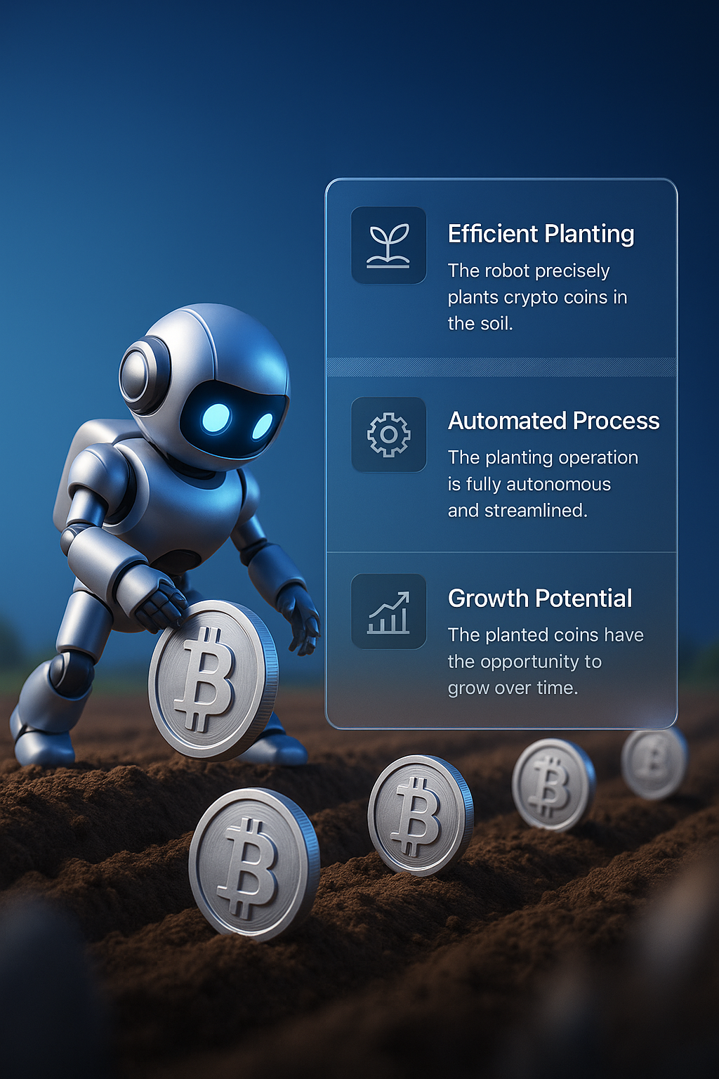 A 3D robot is planting crypto coins in soil, showcasing an automated planting process. The scene includes a clear interface with features highlighting efficiency, automation, and growth potential.