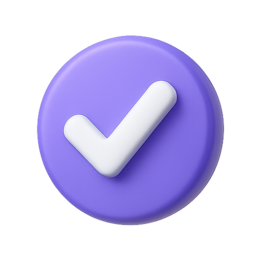 Stylized 3D icon featuring a purple circular button with a white checkmark, perfect for UI design, applications, and digital interfaces.