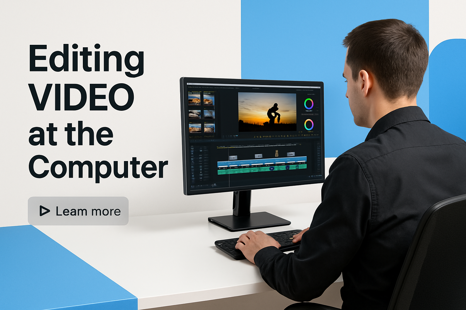 /Collection: /by davooda/Type: PNG/A professional video editing setup featuring a user editing a video on a computer. The clean corporate style includes bold typography and a balanced layout with geometric backgrounds.