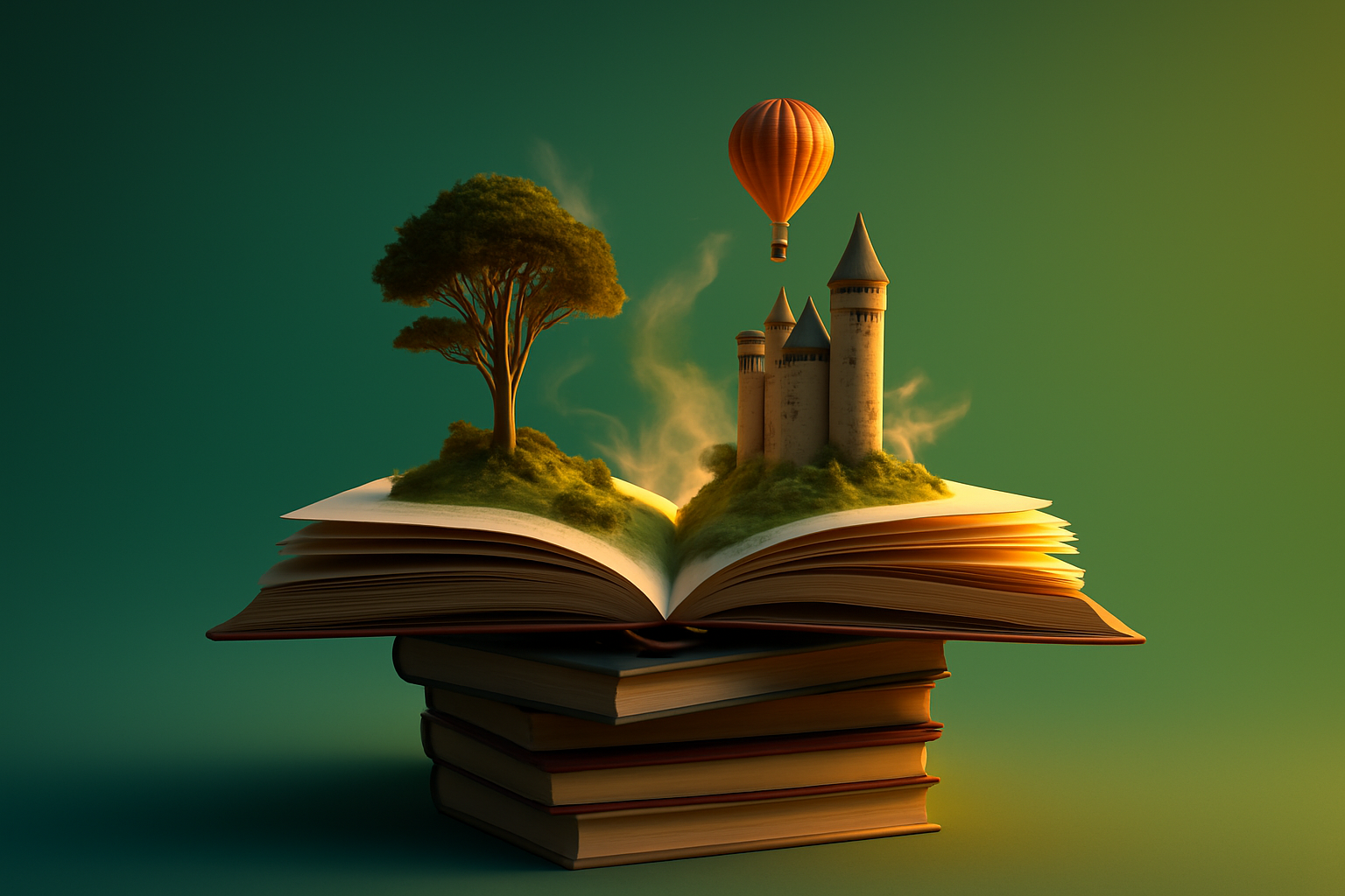 /Collection: /by davooda/Type: PNG/A captivating 3D illustration featuring an open book with a castle and a hot air balloon emerging from its pages, set against a vibrant, solid color background.