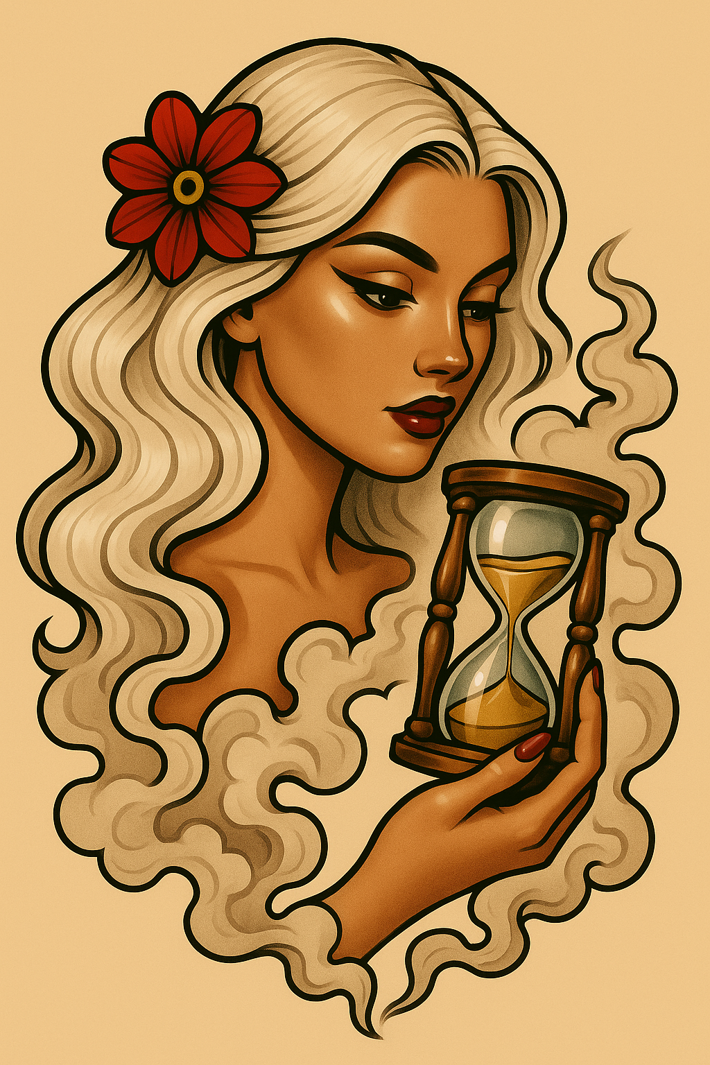 Stylized Tattoo Art of a Girl with Hourglass and Smoke
