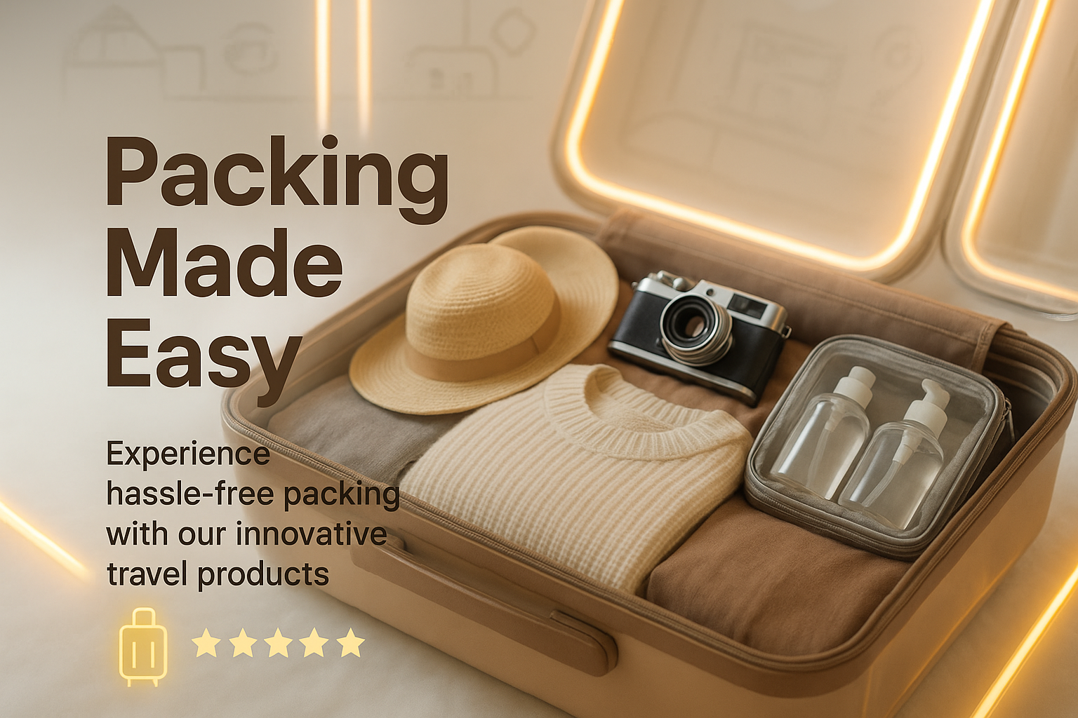 A visually appealing image showcasing an organized suitcase with travel essentials, emphasizing hassle-free packing. Ideal for travel product marketing.