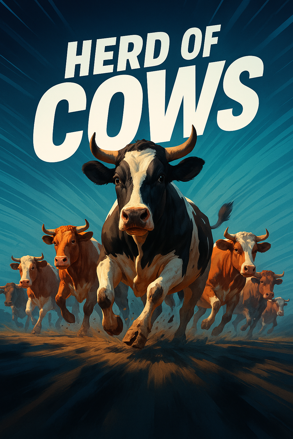 /Collection: /by davooda/Type: PNG/A dynamic scene featuring a herd of cows running towards the viewer. The background showcases a smooth gradient, while the bold title emphasizes the energetic movement of the cows.