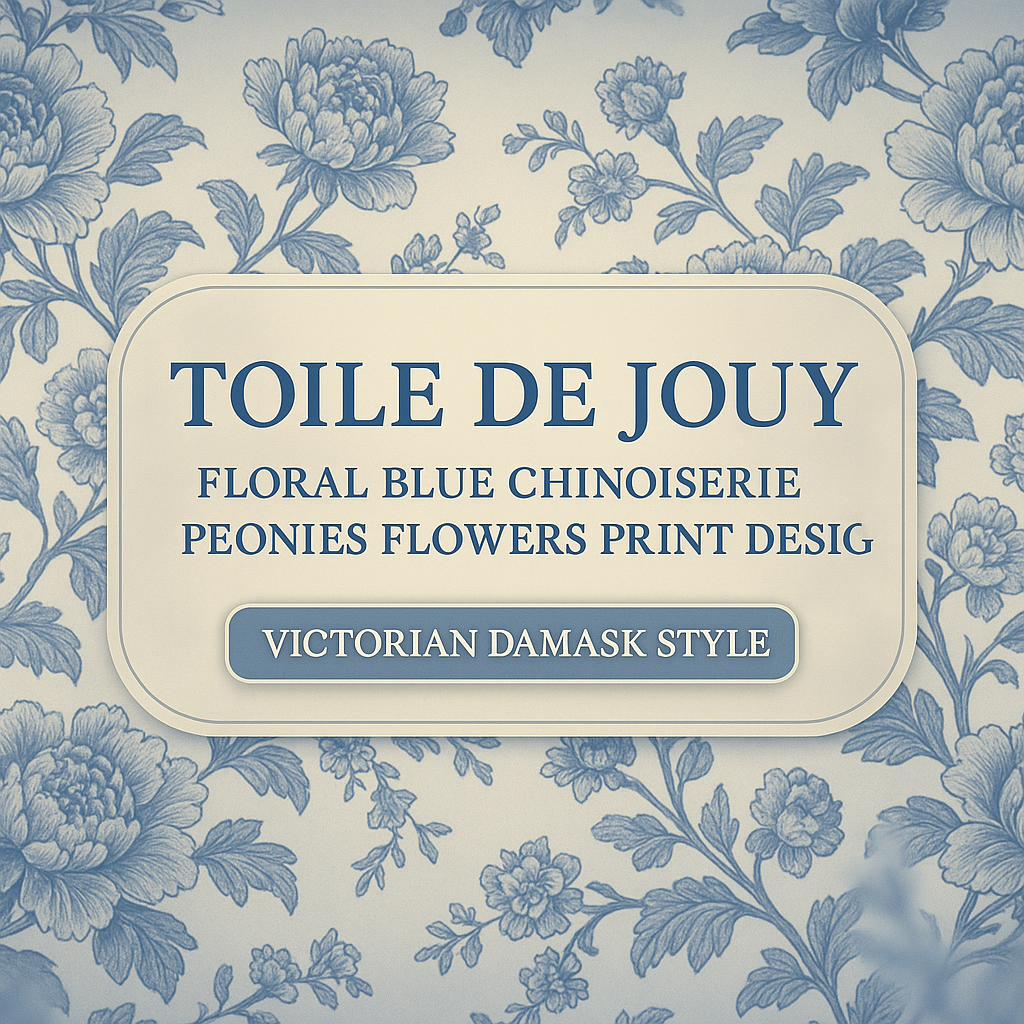 Elegant design featuring a Victorian damask style floral pattern with peonies in blue and white tones, suitable for textile or wallpaper applications.