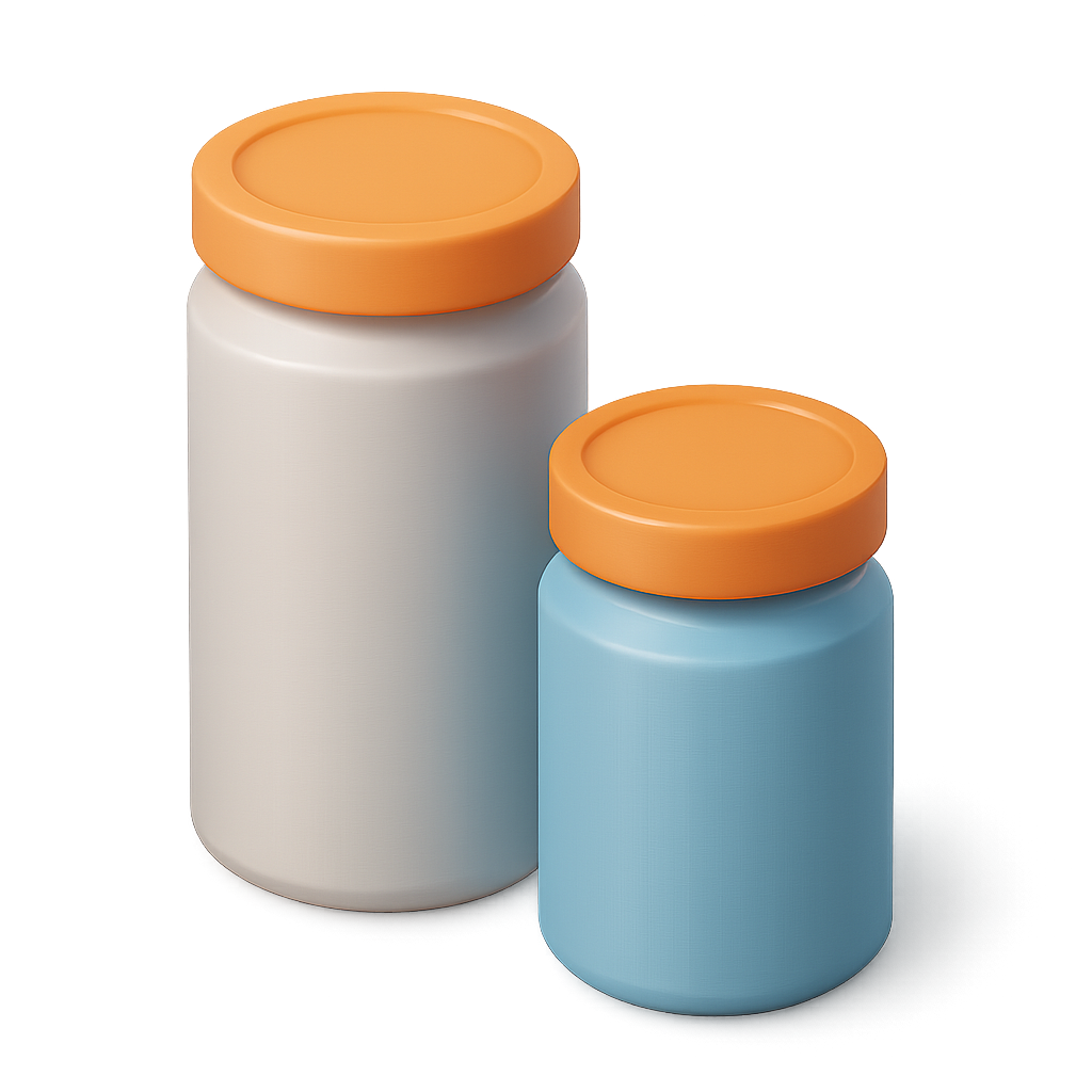 /Collection: /by davooda/Type: PNG/Two 3D cylindrical containers, one white and one blue, with vibrant orange lids. The design showcases a three-quarter view, emphasizing a modern and sleek aesthetic.