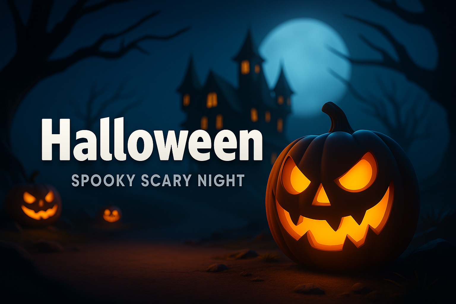 /Collection: /by davooda/Type: PNG/A 3D render featuring a spooky Halloween landscape with carved pumpkins and a haunted house. The dark forest and eerie ambiance set a chilling mood for the holiday.