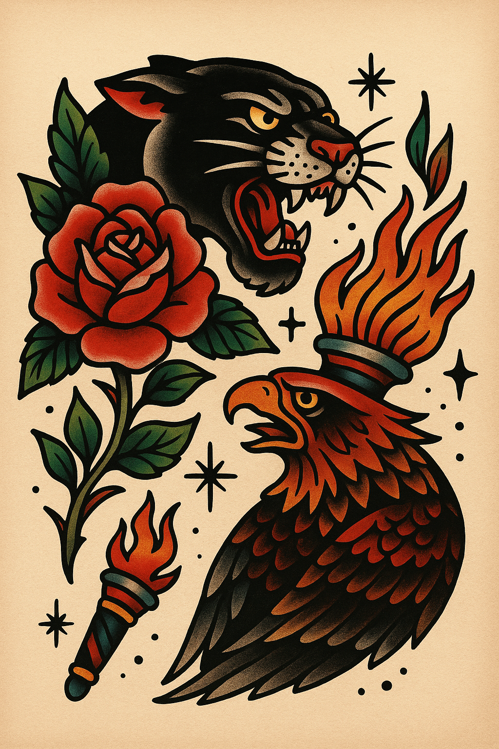 Bold Vintage Tattoo Art Featuring Panther, Rose, and Eagle