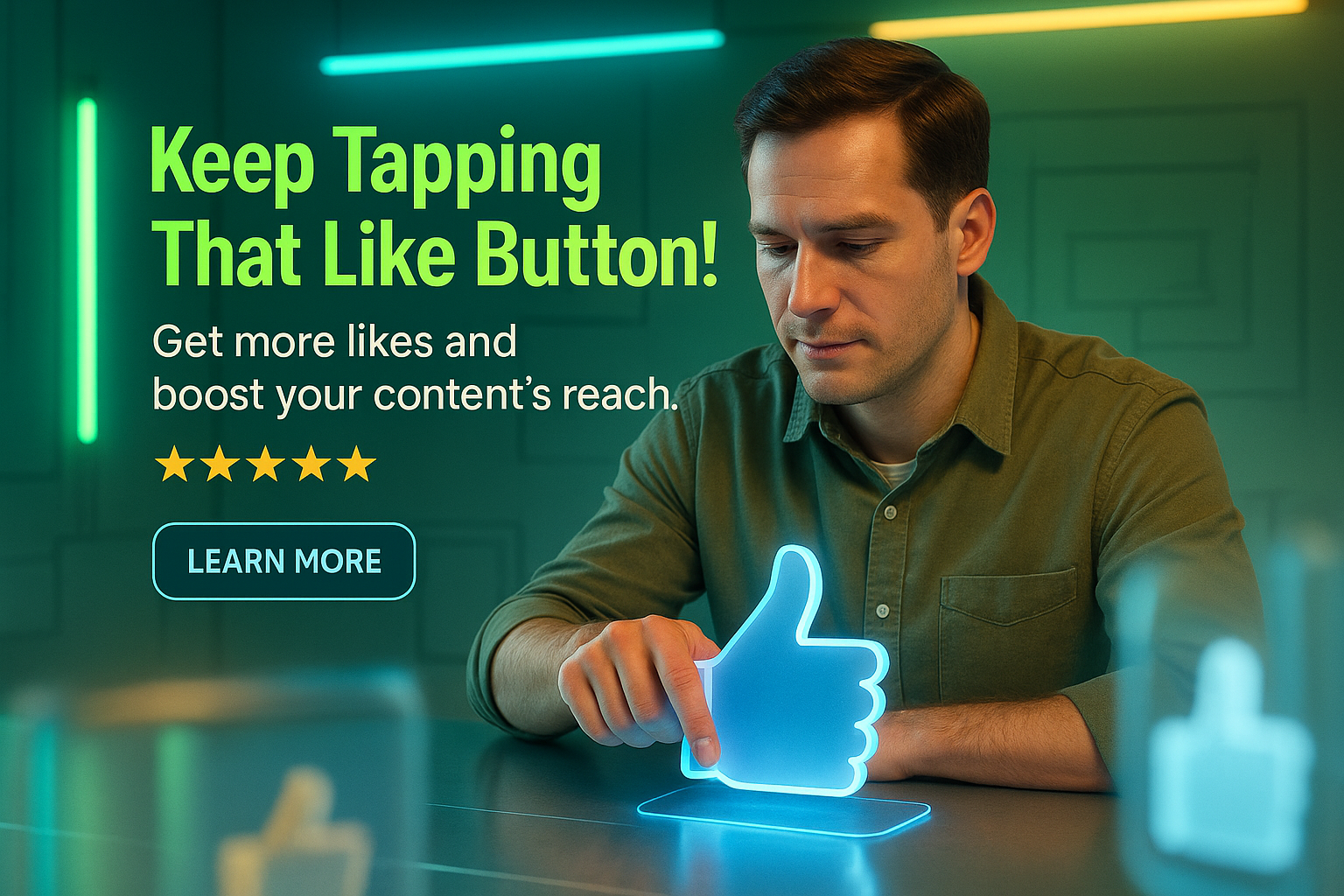 Vibrant social media promotion graphic featuring a man interacting with a glowing thumbs-up icon, designed to encourage user engagement and content sharing.