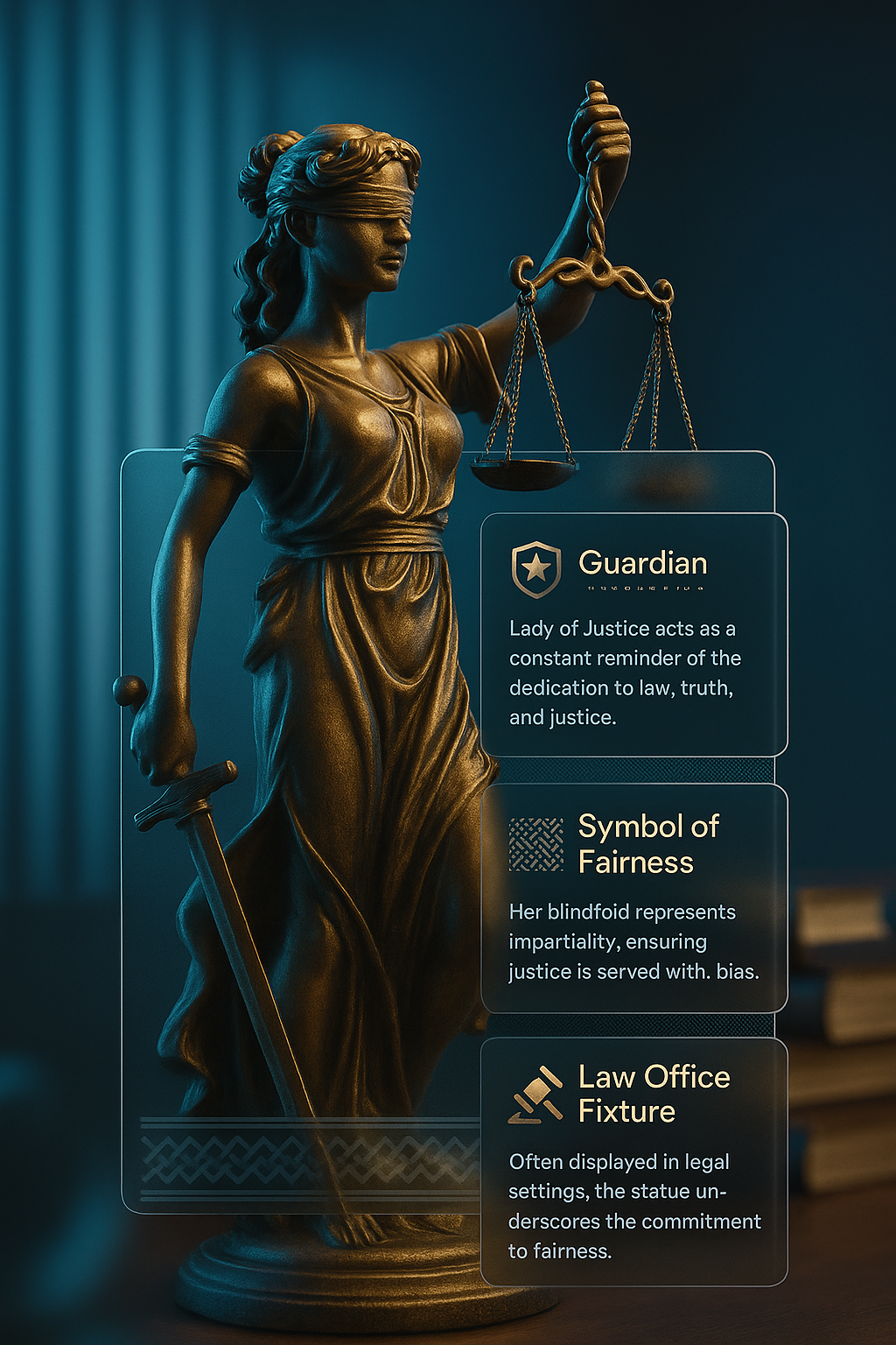 A detailed 3D illustration of the Lady Justice statue, blindfolded and holding scales, symbolizing fairness and truth in a law office environment.