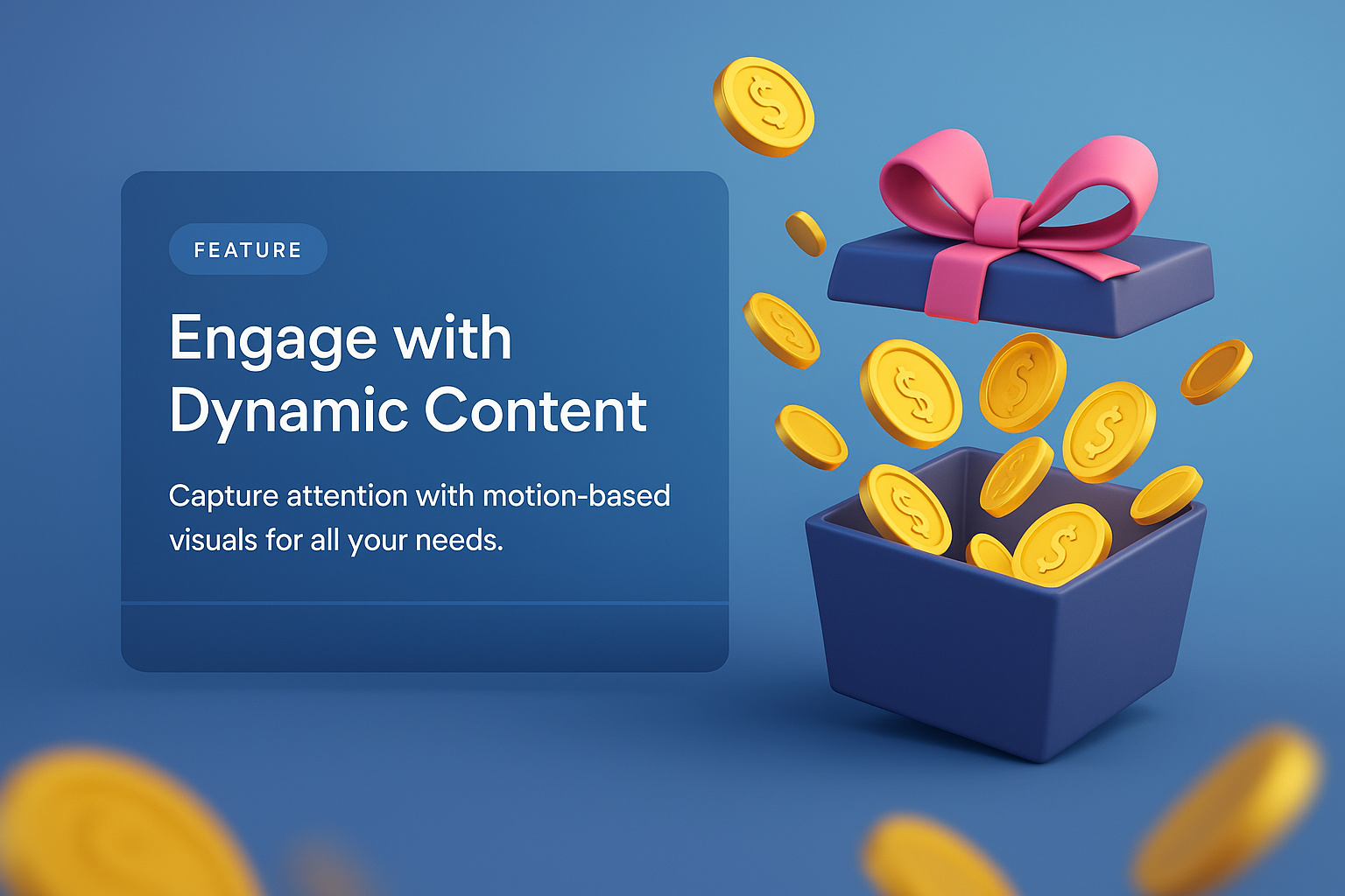 A visually striking 3D illustration featuring a gift box with a pink ribbon, overflowing with golden coins against a smooth blue gradient background. The image emphasizes dynamic content engagement.