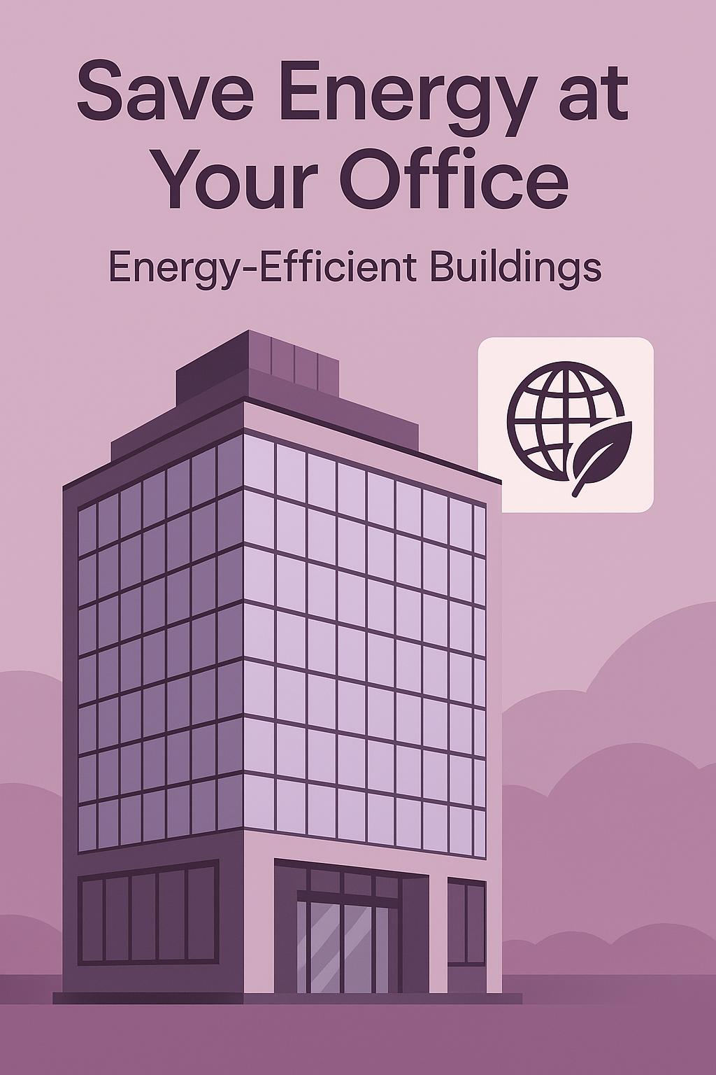 Informative graphic promoting energy efficiency in office buildings, featuring a modern architectural illustration and eco-friendly symbols, ideal for workplace sustainability campaigns.