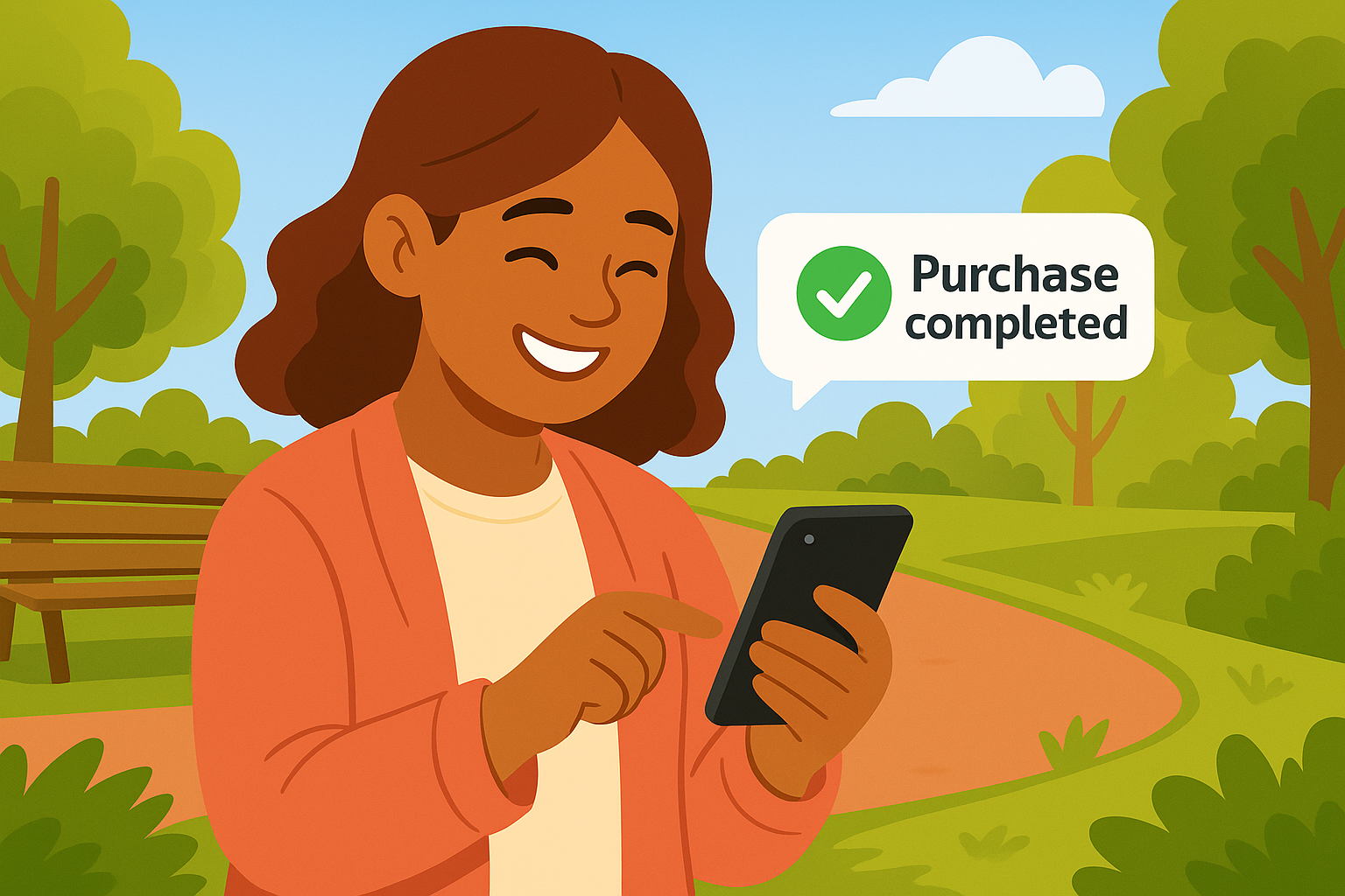Illustration depicting a joyful person using a smartphone in a park, celebrating a completed purchase. The vibrant colors and friendly design appeal to a tech-savvy audience.