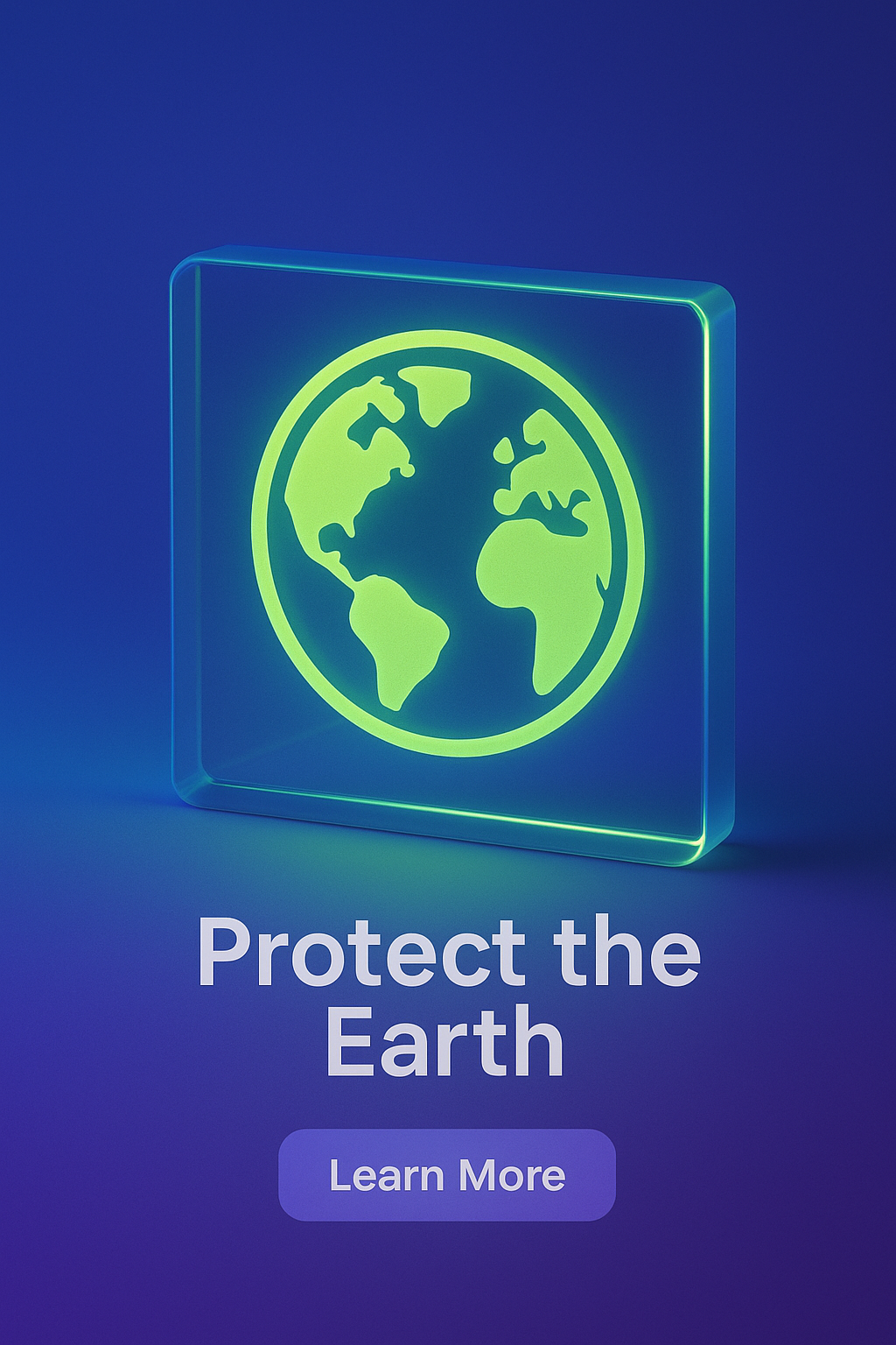 A glowing earth icon in a semi-transparent glass frame, illuminated by neon green light. The vibrant blue background enhances the glowing effect, creating a striking visual.