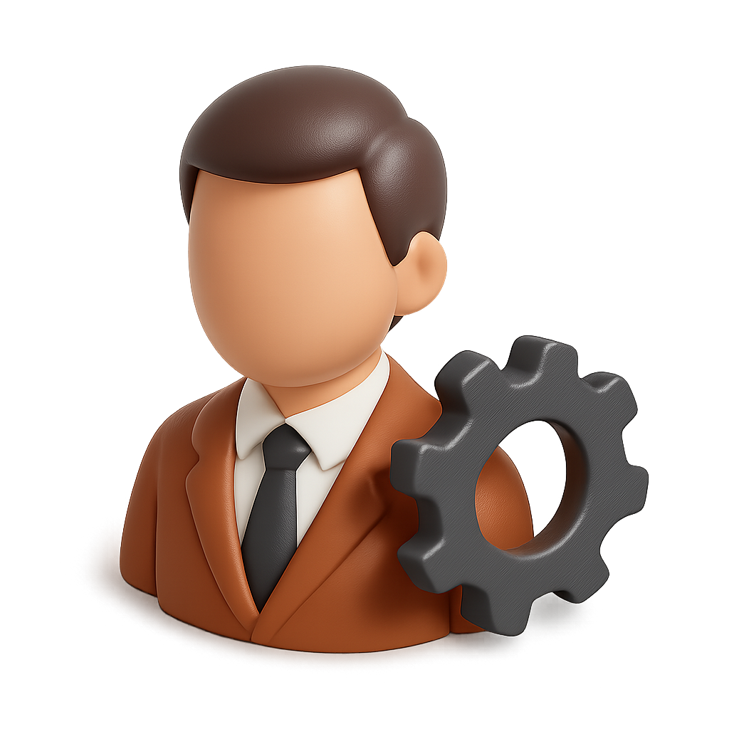 A minimalist 3D icon depicting a faceless admin figure in a suit, with a gear symbol beside it, set against a dark gradient background.