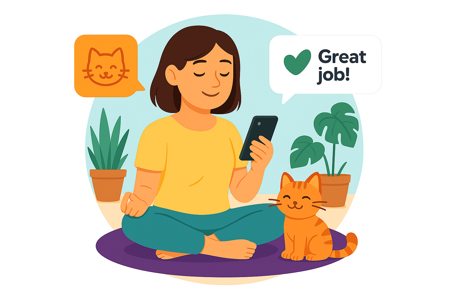/Collection: /by davooda/Type: PNG/A vibrant and cheerful digital illustration depicting a person sitting cross-legged with a smartphone, accompanied by a cat. Ideal for pet-related content or motivational themes.