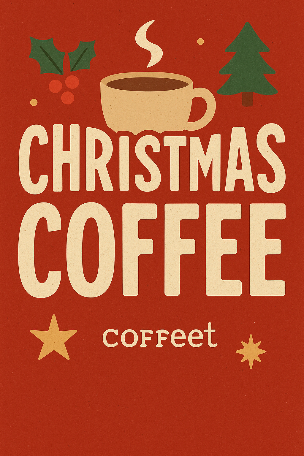 A cheerful holiday-themed graphic featuring a coffee cup, Christmas trees, and stars, designed for seasonal promotions or festive social media posts.