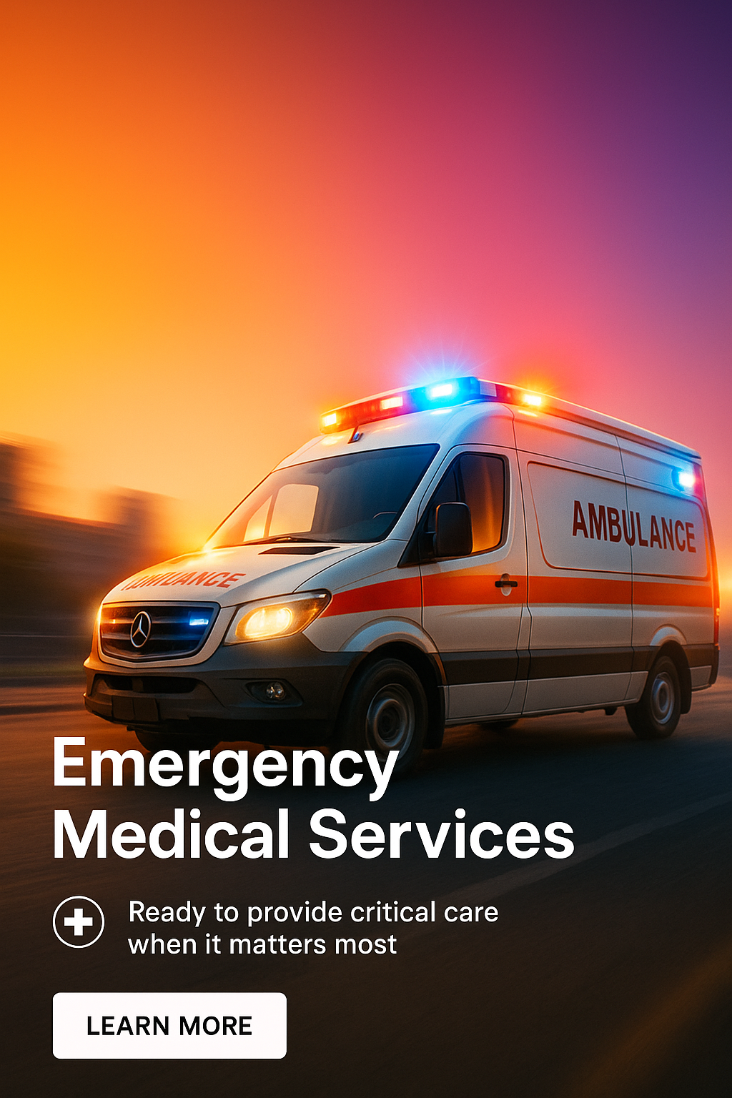 This image showcases an ambulance in motion at sunset, highlighting emergency medical services. It's designed for promotional use to raise awareness about critical care.