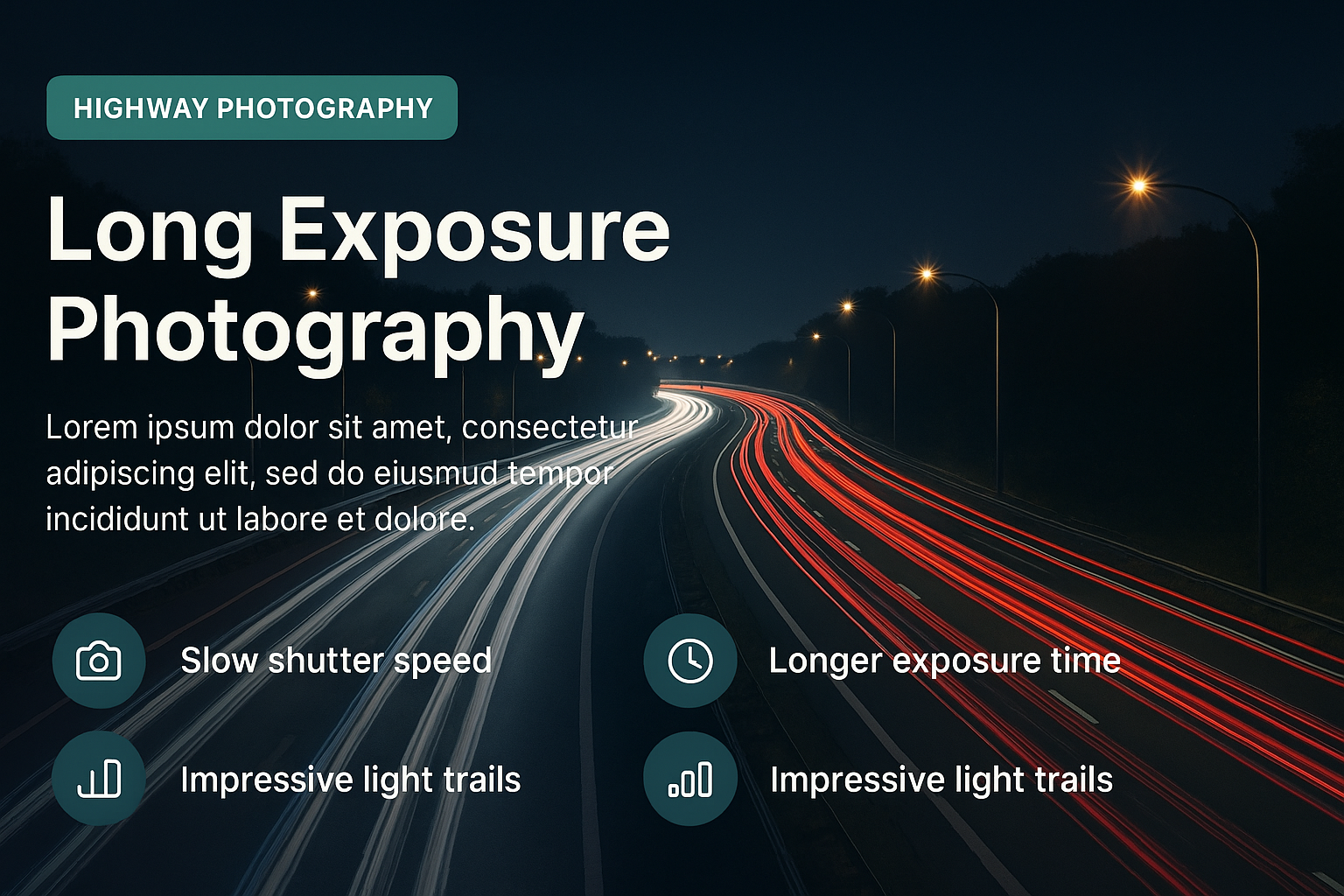 /Collection: /by davooda/Type: PNG/Informative graphic showcasing long exposure photography techniques with visual elements illustrating light trails. Ideal for photography enthusiasts and educators.